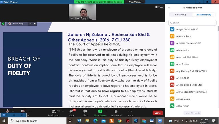 Speaker, Introduction to Employment and Industrial Relation Law in Malaysia webinar, 2020